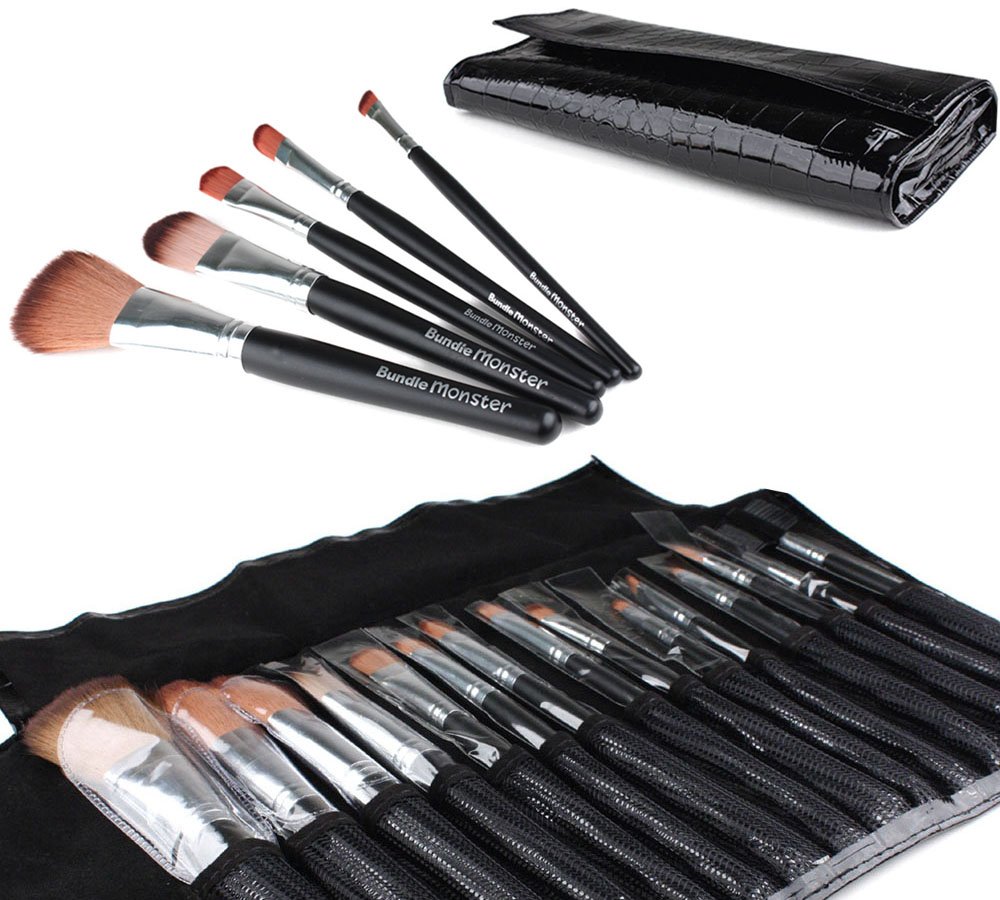 This brand new make up set from Bundle Monster is for the pros or make up enthusiasts that just want the necessities for any stylish look. Whether day, night or specialty looks, this set will have all the brushes to polish your design. This 15pc set comes with a fashionable and black faux crocodile roll up carrying case to store all your favorite Bundle Monster brushes. Each brush comes with a long black colored wooden handle and is covered with clear plastic wrap for cleanliness and to protect the fibers of the brush. Our goal is to strike a balance between price and quality and bring tremendous values to our customers. Rolled Up Dimension: 8" x 4" x 1.25". Weight: 6.7oz. For best result, recommended to wash brushes & air dry before use. This affordable makeup brushes set contains (See Picture) large powder brush, medium powder brush, angle powder brush, foundation brush, shadow brush # 1, #2, #3, flat shadow brush, small shadow brush # 1, # 2, eyeliner brush, lip brush, small fan brush, mascara/brow brush, and dual eyebrow brush/lash comb. How to Clean Makeup Brushes:1. Run the bristles of brush under warm running water.2. Apply a small amount of gentle shampoo to bristles and work into a light lather.3. Rinse bristles thoroughly under running water. You will notice that the water leaving the brush is tinted from old makeup.4. Continue rinsing until no color leaves the brush.5. Allow it to air-dry. Bundle Monster is a registered trademark of Remi Collections LLC and is exclusively distributed by Bundle Monster. Bundle Monster trademark is protected by US Trademark Law.